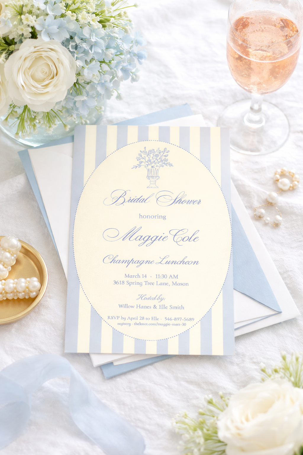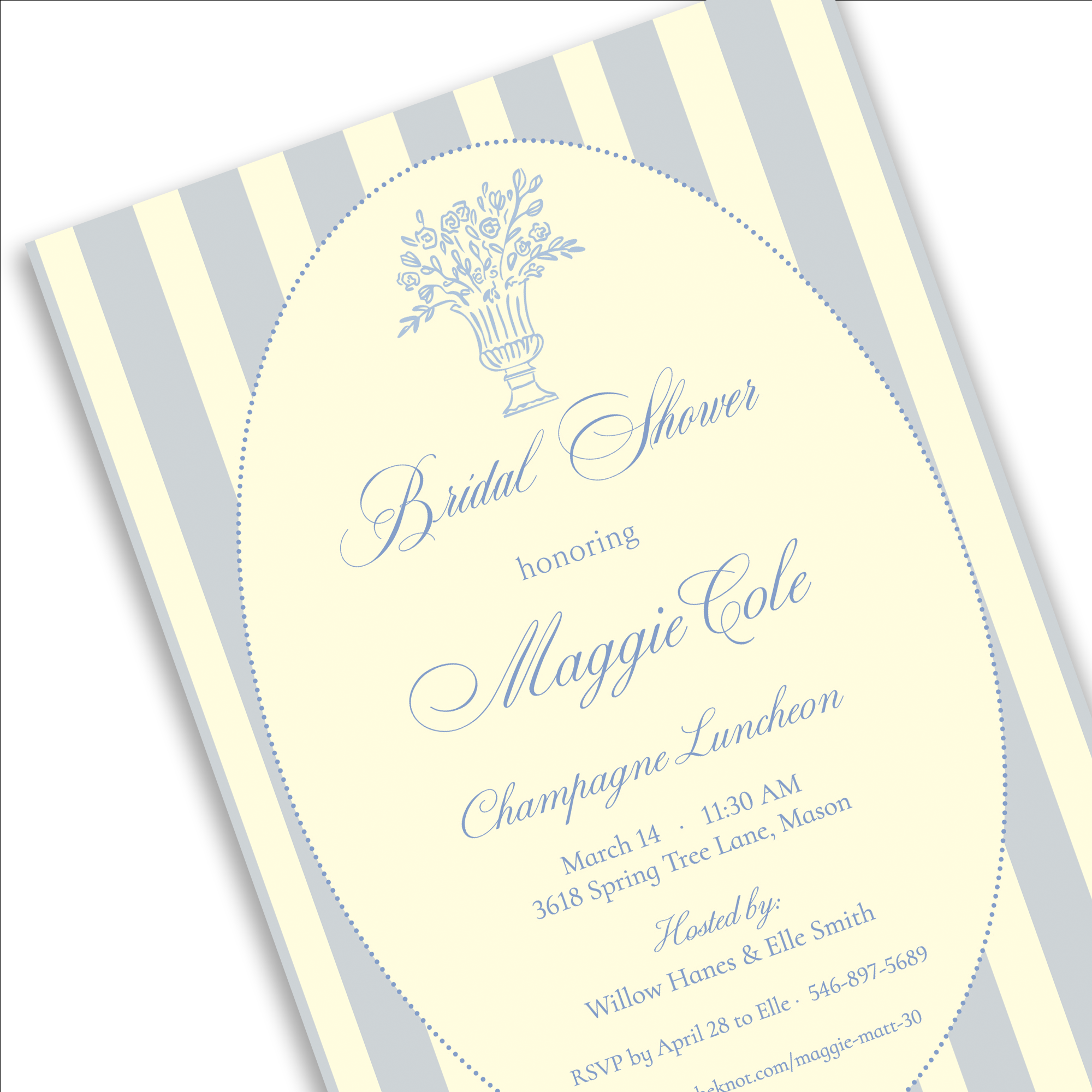 Host a timeless bridal shower with our Blue Stripe Bridal Shower Invitation, professionally printed for your convenience. Featuring soft vertical stripes, elegant script lettering, and delicate floral artwork, this invitation is perfect for a champagne luncheon, bridal brunch, bridal luncheon, or wedding shower.