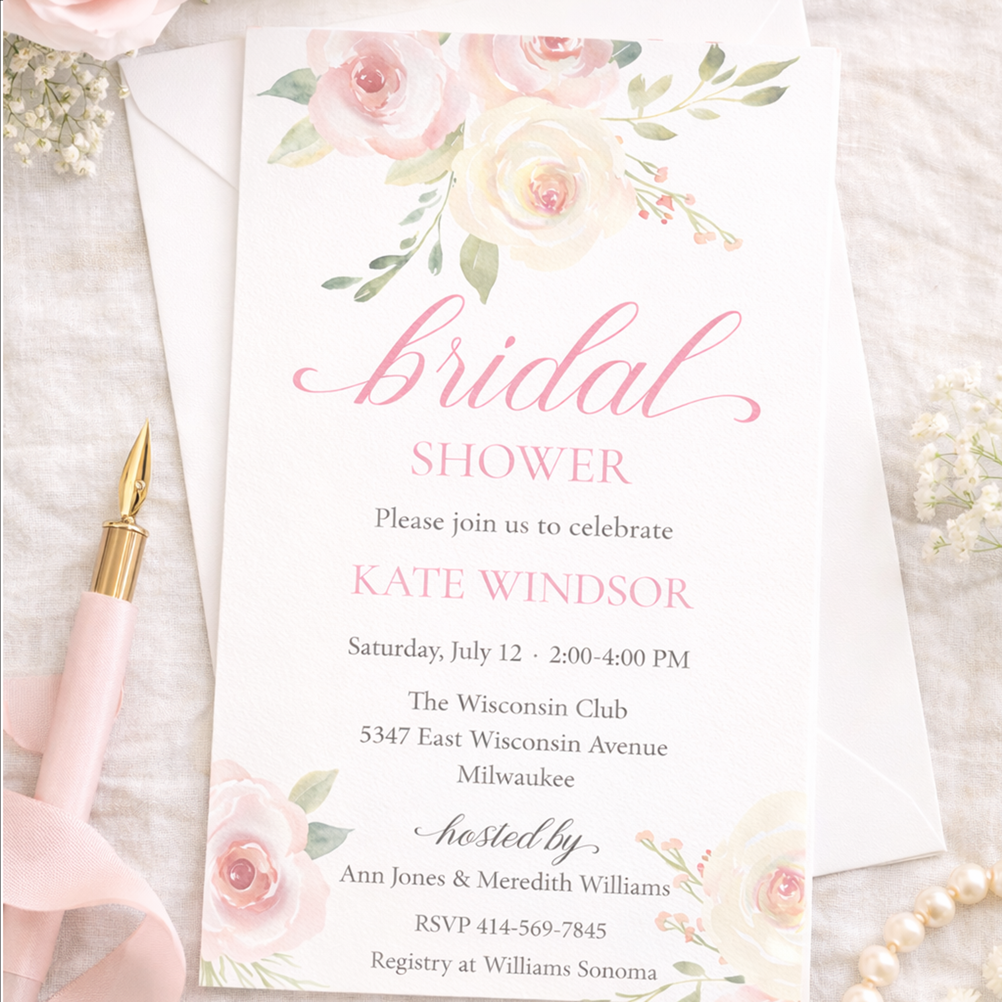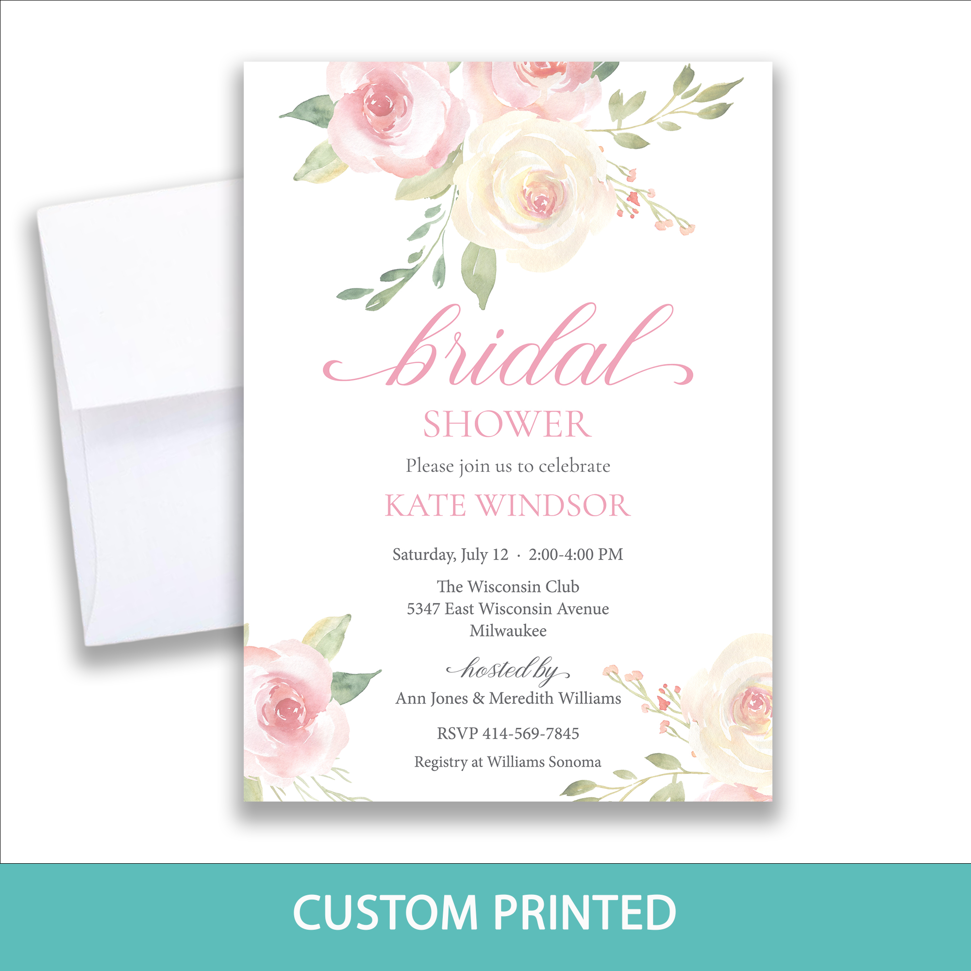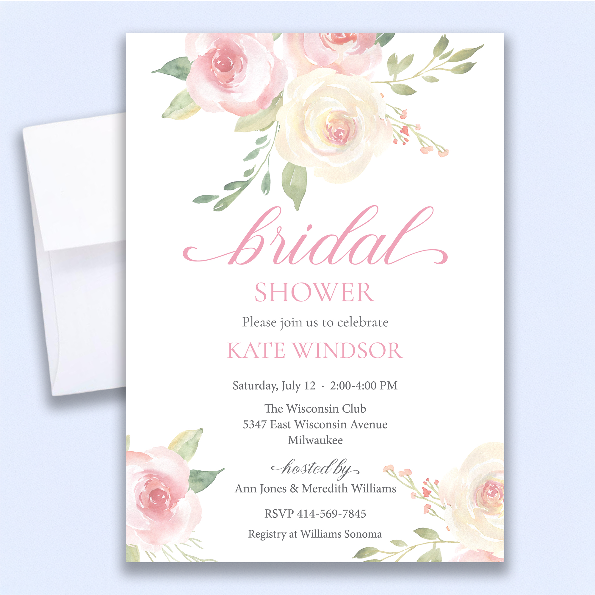 Blush Roses Invitation features soft pink roses and lush greenery in a classic watercolor design — perfect for weddings, bridal showers, baby showers, birthdays, garden parties, and more.
