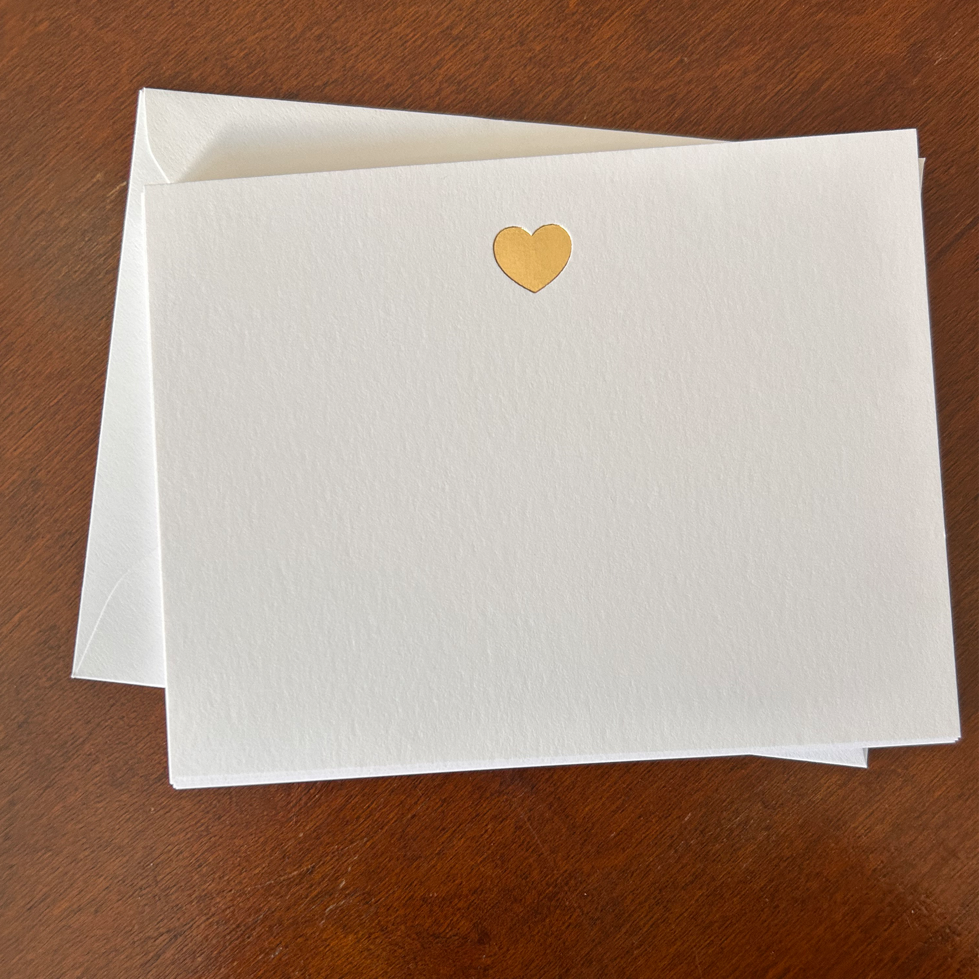 Gold foil heart notecards on with euro flap envelopes. Elegant blank cards for wedding thank yous, Valentine’s notes, and everyday correspondence. Pack of 10 cards and 10 euro flap envelopes.