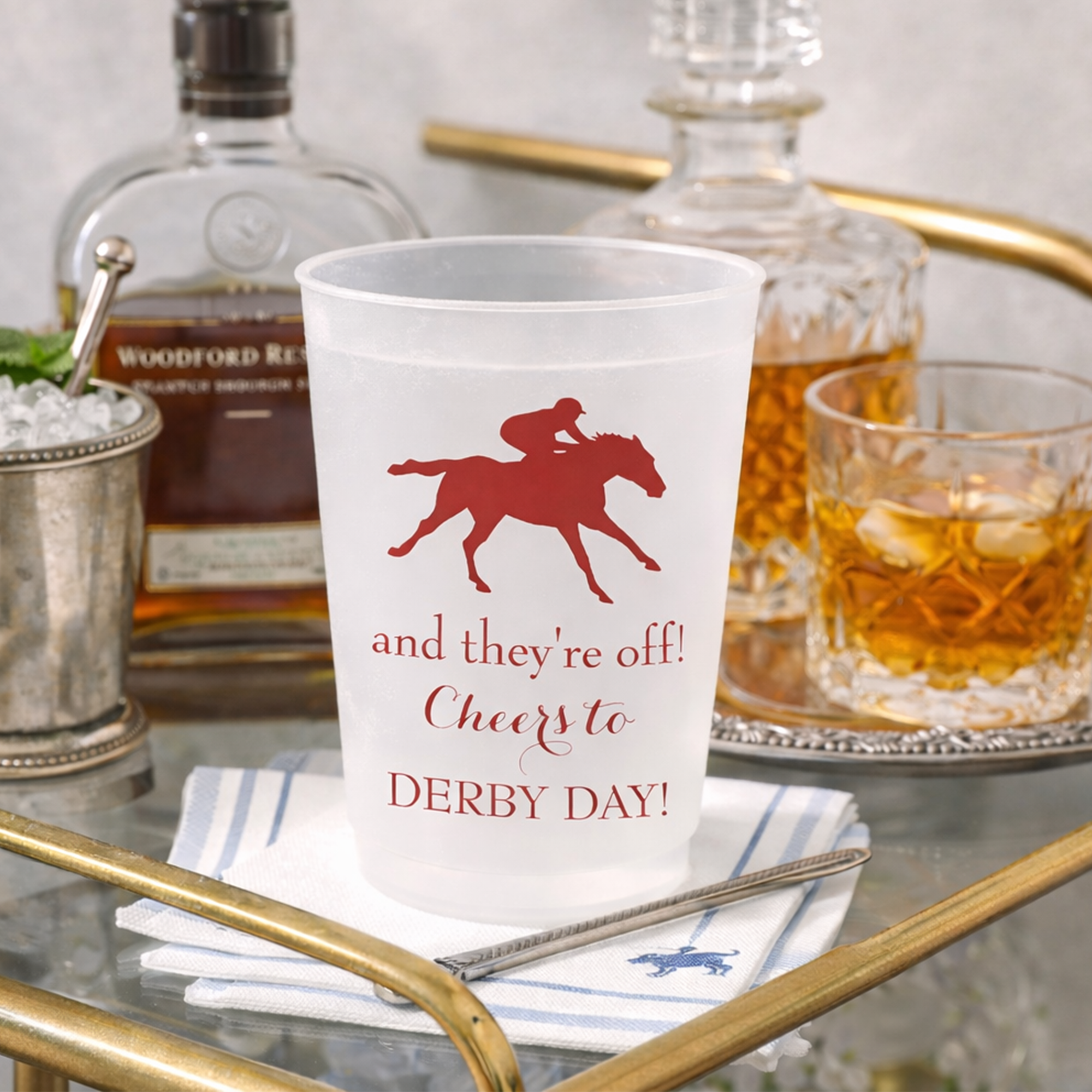 These reusable frosted cups are perfect for serving Mint Juleps, bourbon cocktails, beer, and race day signature drinks. Designed to complement classic Derby styling — antique silver, julep cups, hydrangeas, and striped linens — they instantly create a cohesive and festive bar setup.