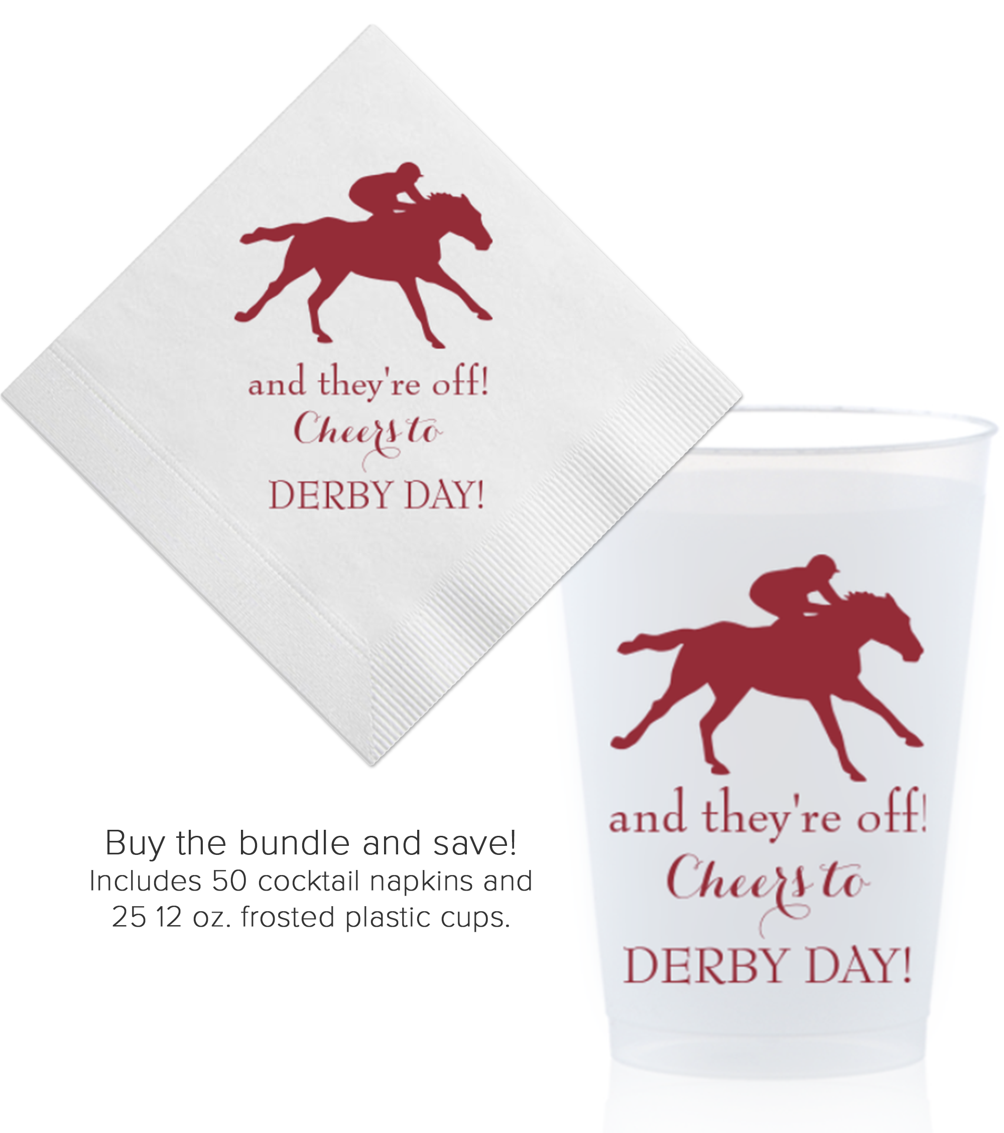 Make your Kentucky Derby celebration effortless and elevated with our frosted jockey horse party cups featuring the phrase “And They’re Off! Cheers to Derby Day!”